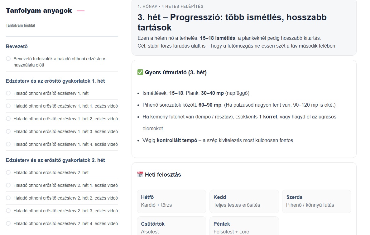 4 hetes, futókra specializált erősítő tanfolyam, amely segít stabilabb törzset, jobb futómozgást és magabiztosabb versenyeket elérni – edzőterem és eszközök nélkül.